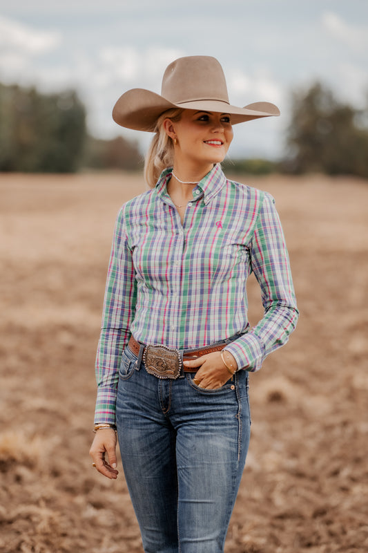 CLEARANCE - Ladies Slim Fit Long Sleeve Shirt - Green/Pink Plaid