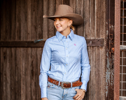 CLEARANCE - Ladies Slim Fit Long Sleeve Shirt - Cornflower Blue Stripe