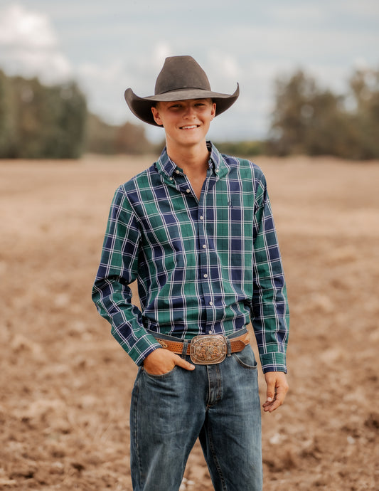 Men's Long Sleeve Shirt - Green/Navy/White Plaid