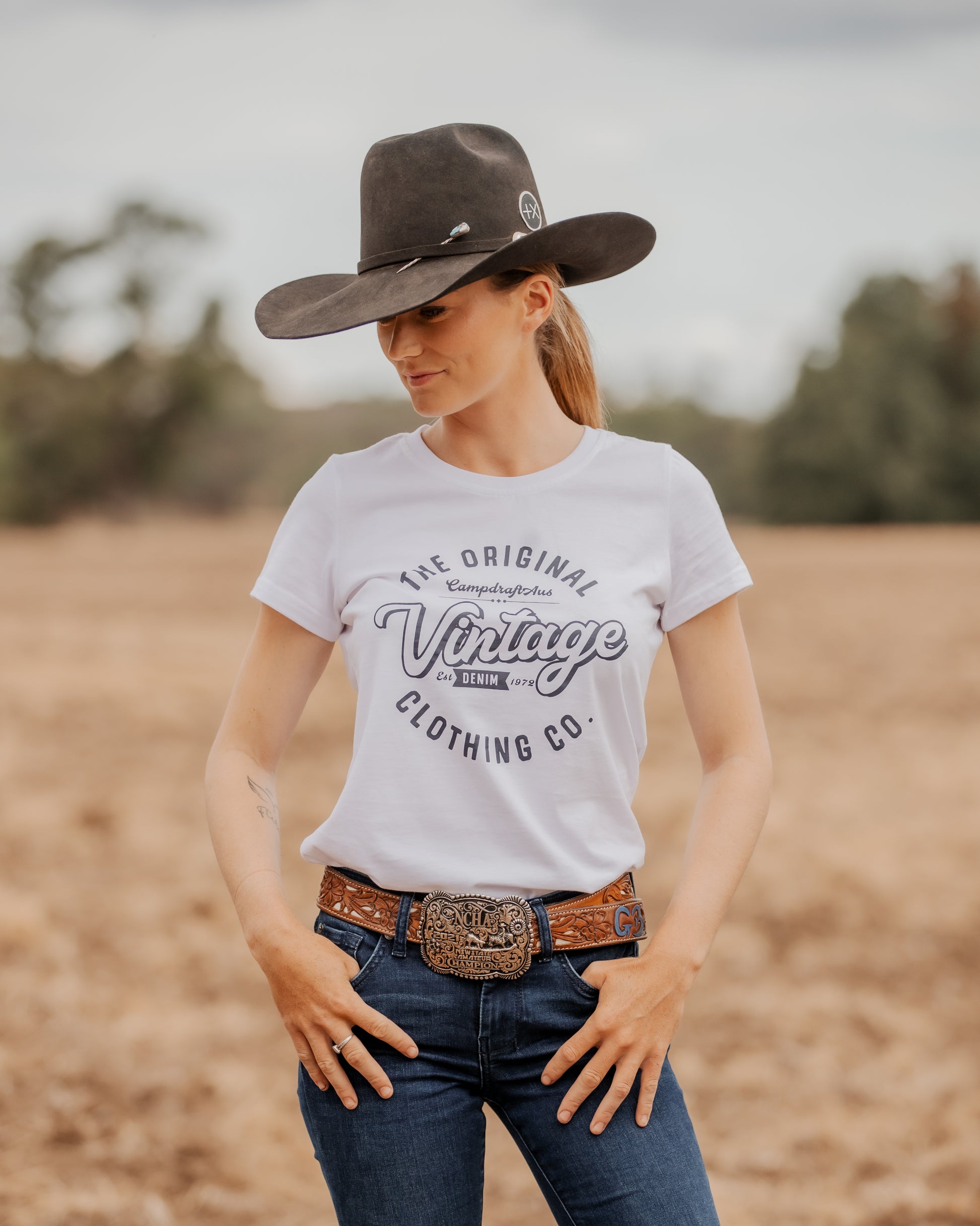 Experience comfort and style with our Ladies Vintage Tee in White. Made from high-quality 100% cotton, this tee features a straight cut for a flattering silhouette and a neckline that won't stretch out of shape. With a soft and luxurious feel, this tee is perfect for everyday wear. We recommend sizing down for a more tailored look.